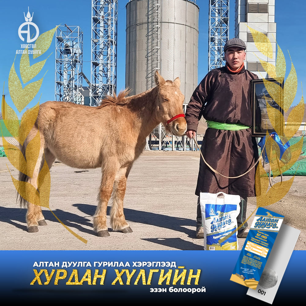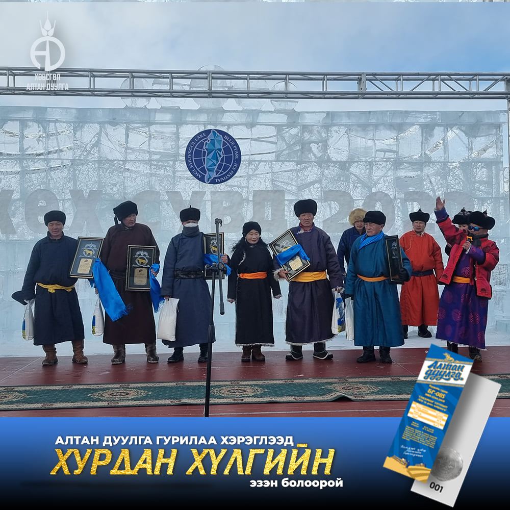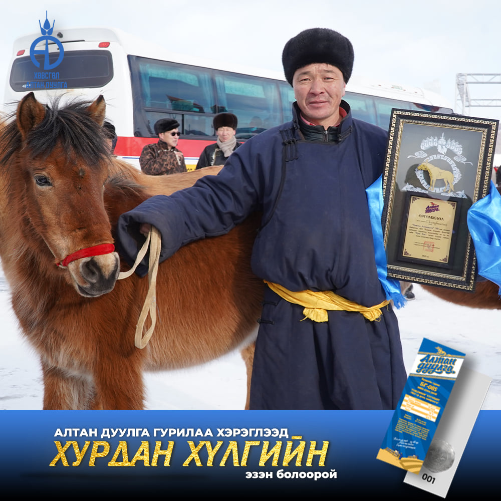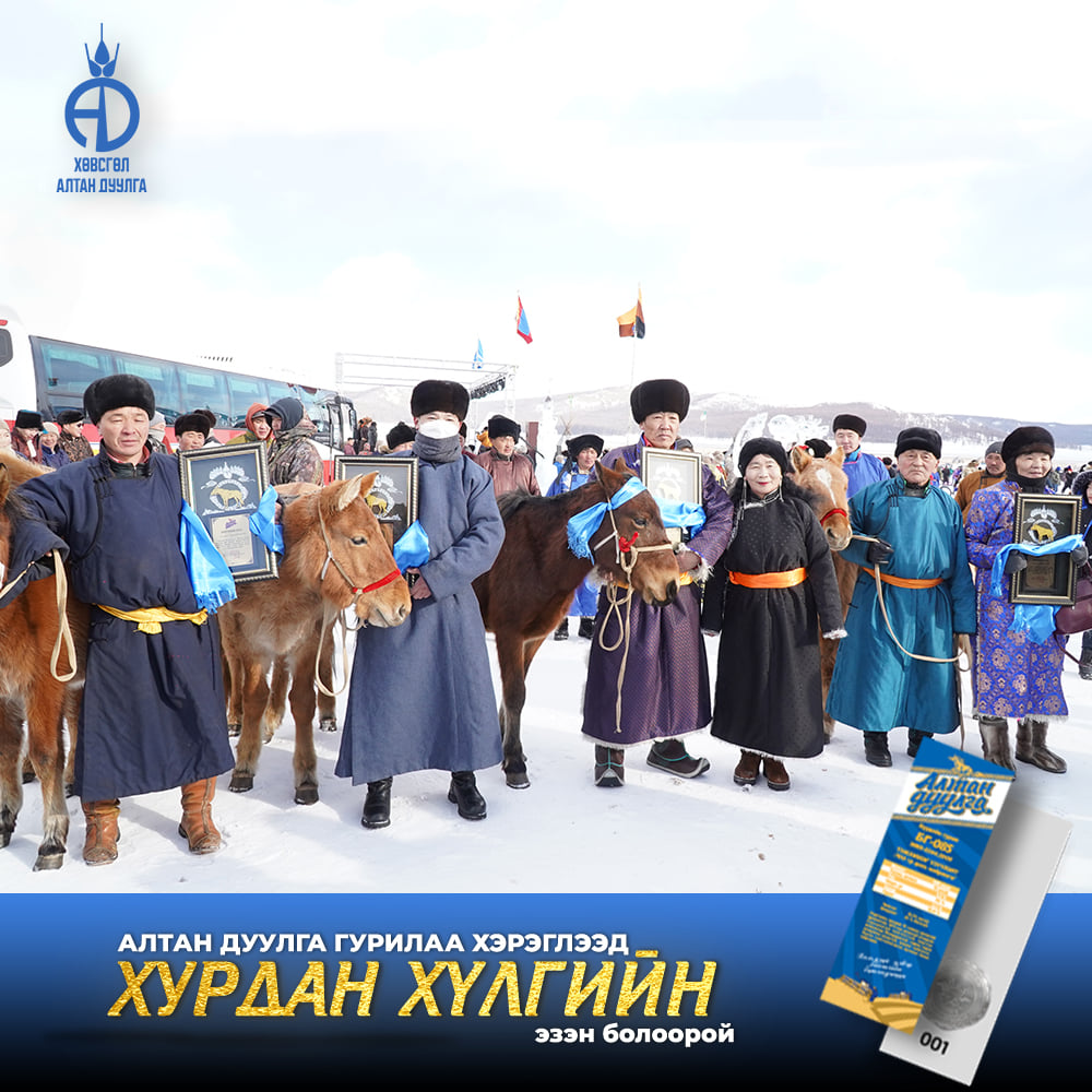 Хөвсгөл алтандуулга ХК 2021-2022 онд хэрэглэгчиддээ зориулан хурдан удмын 108 хүлгийн эзэн тодруулах бэлэгтэй худалдаа зарлан азтан болсон хэрэглэгчиддээ сар бүр гардуулан өгсөөр байгаа билээ. Энэ удаад бид "Хөх сувд-Мөсний баяр 2022" -н тайзан дээрээс Хөвсгөл аймгийн Цагаан уул сумын харъяат Монгол улсын тод манлай уяач Г.Доржпүрэвийн бий болгосон "Ураг Хас"галын хурдын удмын хүлэг морьдыг азтан болсон 10 хэрэглэгчиддээ гардуулан өглөө.
