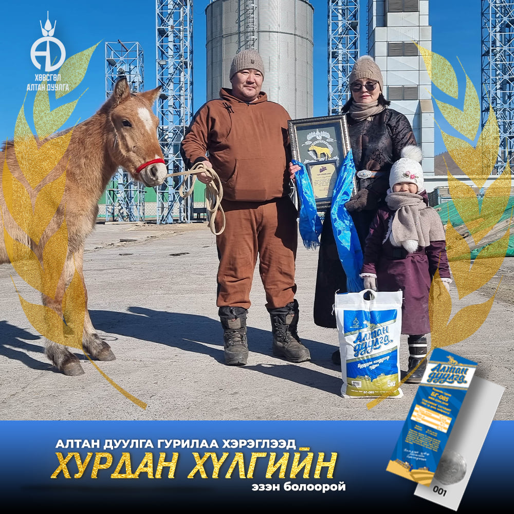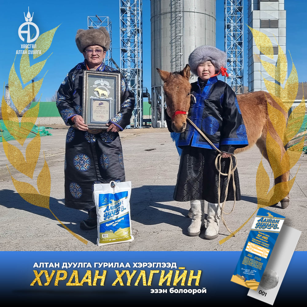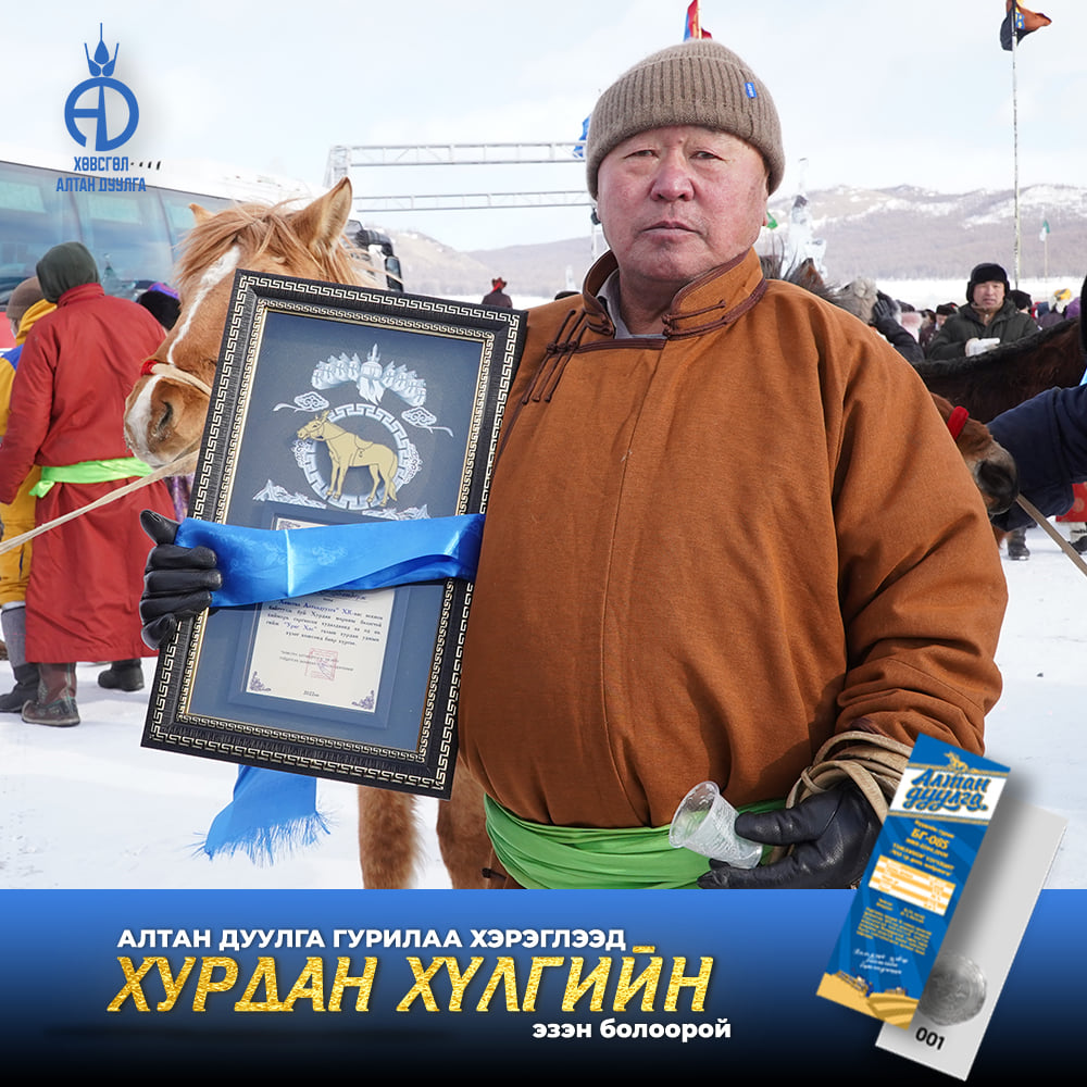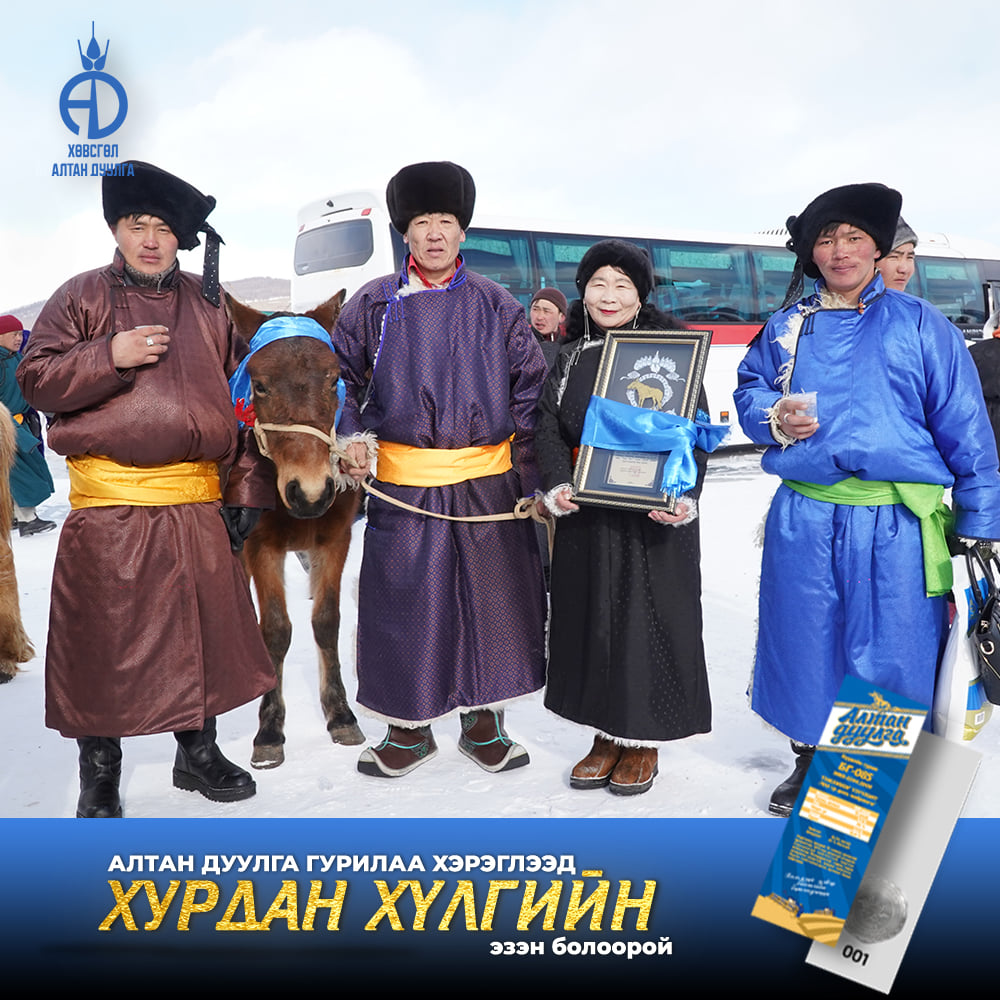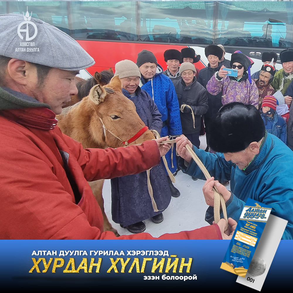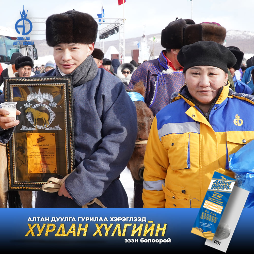 Хөвсгөл алтандуулга ХК 2021-2022 онд хэрэглэгчиддээ зориулан хурдан удмын 108 хүлгийн эзэн тодруулах бэлэгтэй худалдаа зарлан азтан болсон хэрэглэгчиддээ сар бүр гардуулан өгсөөр байгаа билээ. Энэ удаад бид "Хөх сувд-Мөсний баяр 2022" -н тайзан дээрээс Хөвсгөл аймгийн Цагаан уул сумын харъяат Монгол улсын тод манлай уяач Г.Доржпүрэвийн бий болгосон "Ураг Хас"галын хурдын удмын хүлэг морьдыг азтан болсон 10 хэрэглэгчиддээ гардуулан өглөө.