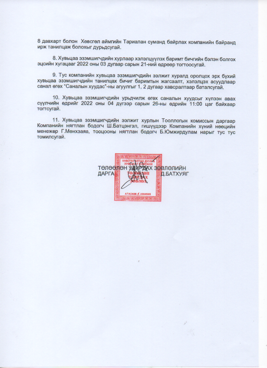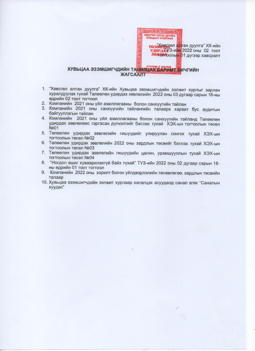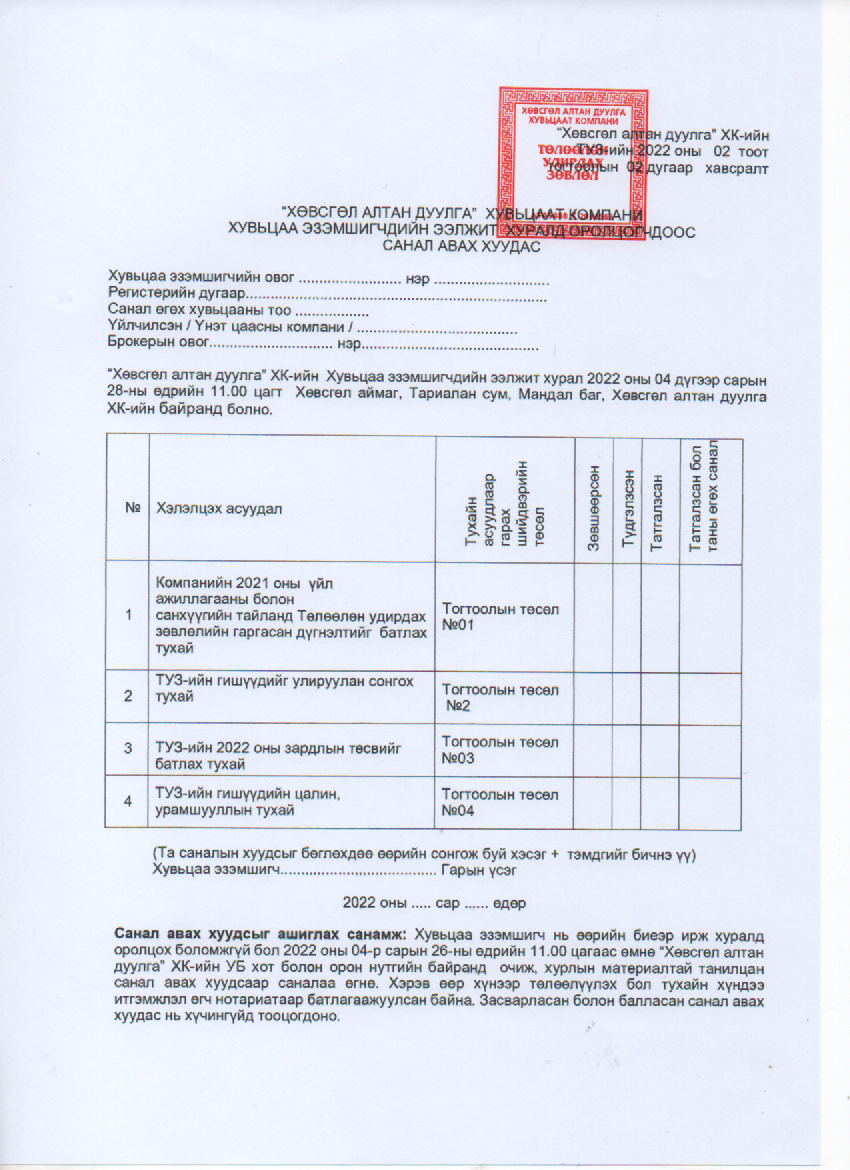 Хувьцаа эзэмшигчдийн хурал 2022 оны 4 сарын 28-ны өдрийн 11:00 цагт Хөвсгөл аймаг, Тариалан сум , Мандал багт байрлах "Хөвсгөл алтандуулга" ХК-ий байранд хуралдана.